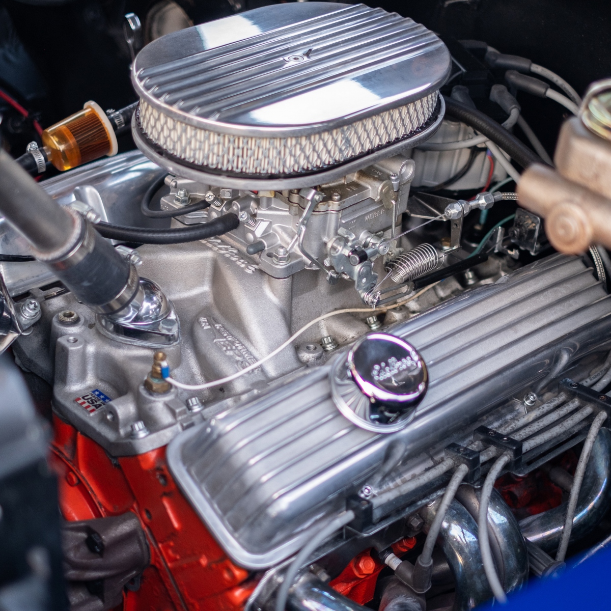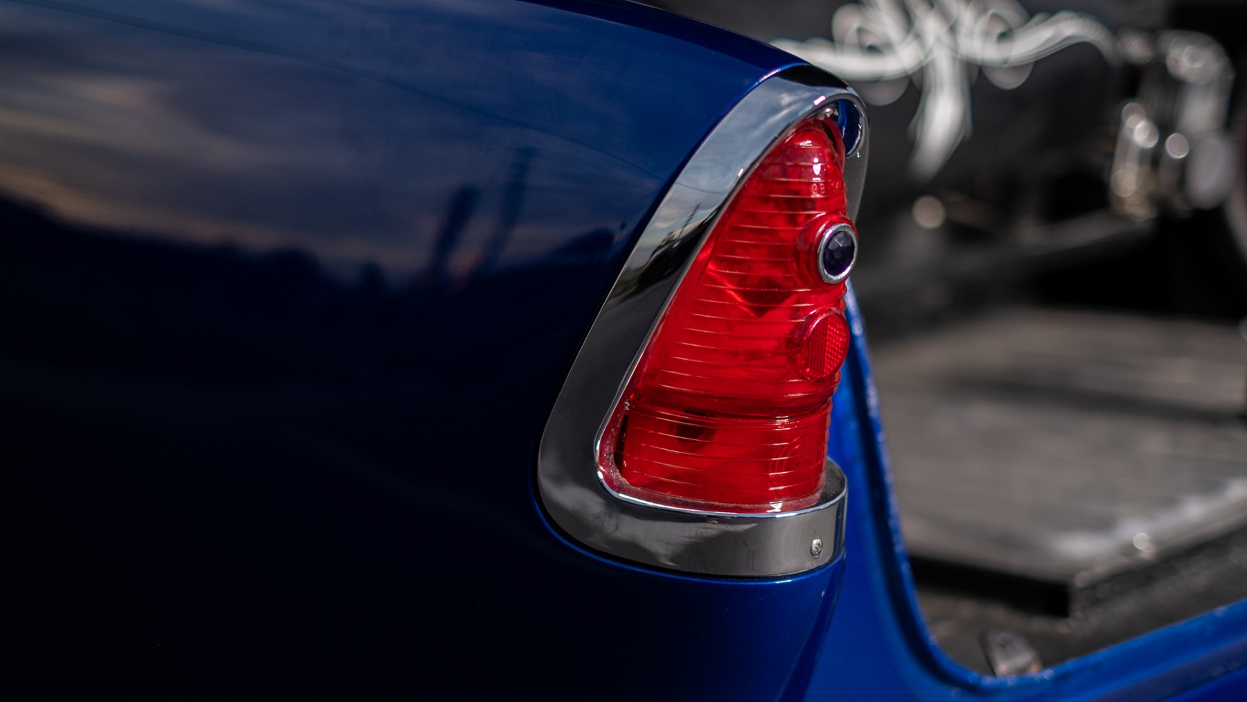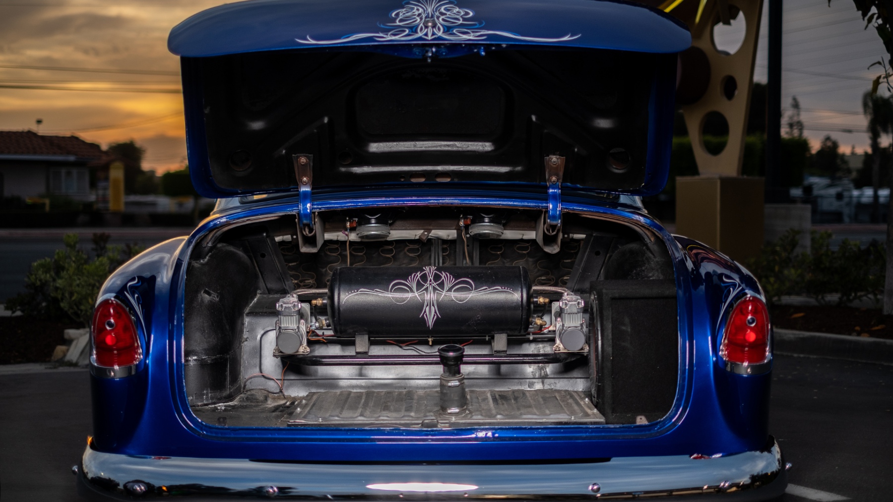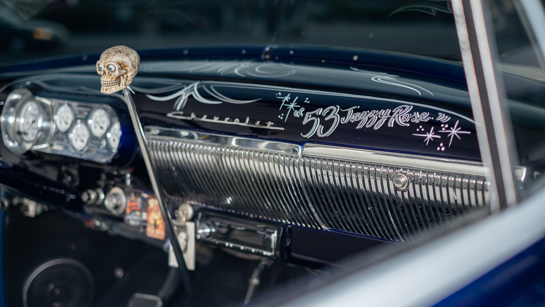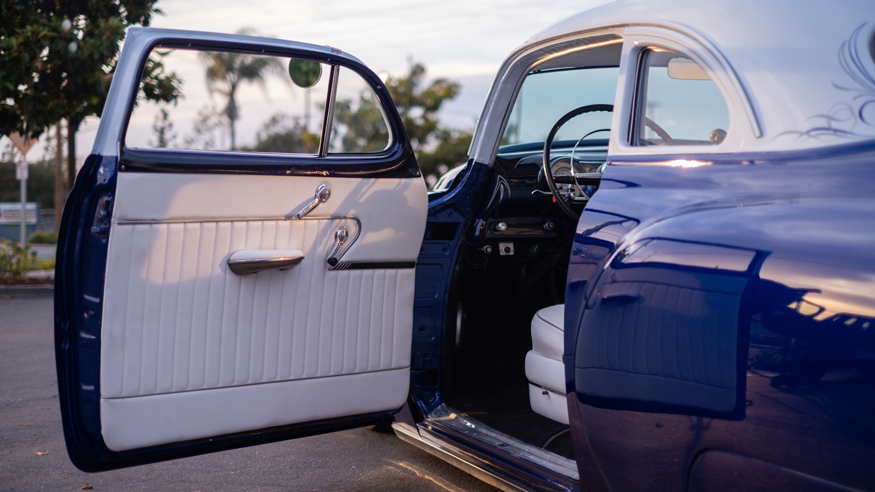 Under the hood Pauly Rivera also from Riverside helped with the swap of the 235 to a 350/350 combo with the help from CePe, President of the Dead Sleds. Pauly also helped with the Mustang II front clip and 4-link rear end and suspension. Paysa/Chuy did the upholstery and Paul’s All Pro Glass did the, well glass. The car was re-wired and then handed over to Frank Rosales at GoodWorx in Lake Elsinore, CA for the San Marino Blue hue and Blue Pearl by Matrix. Then Danny Alvarado laid down the lines.