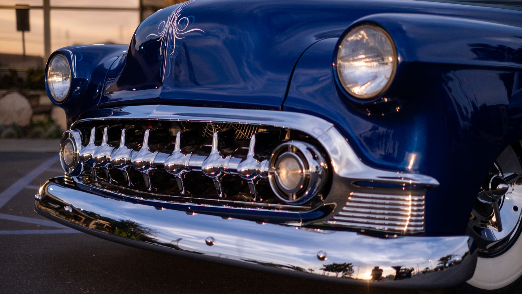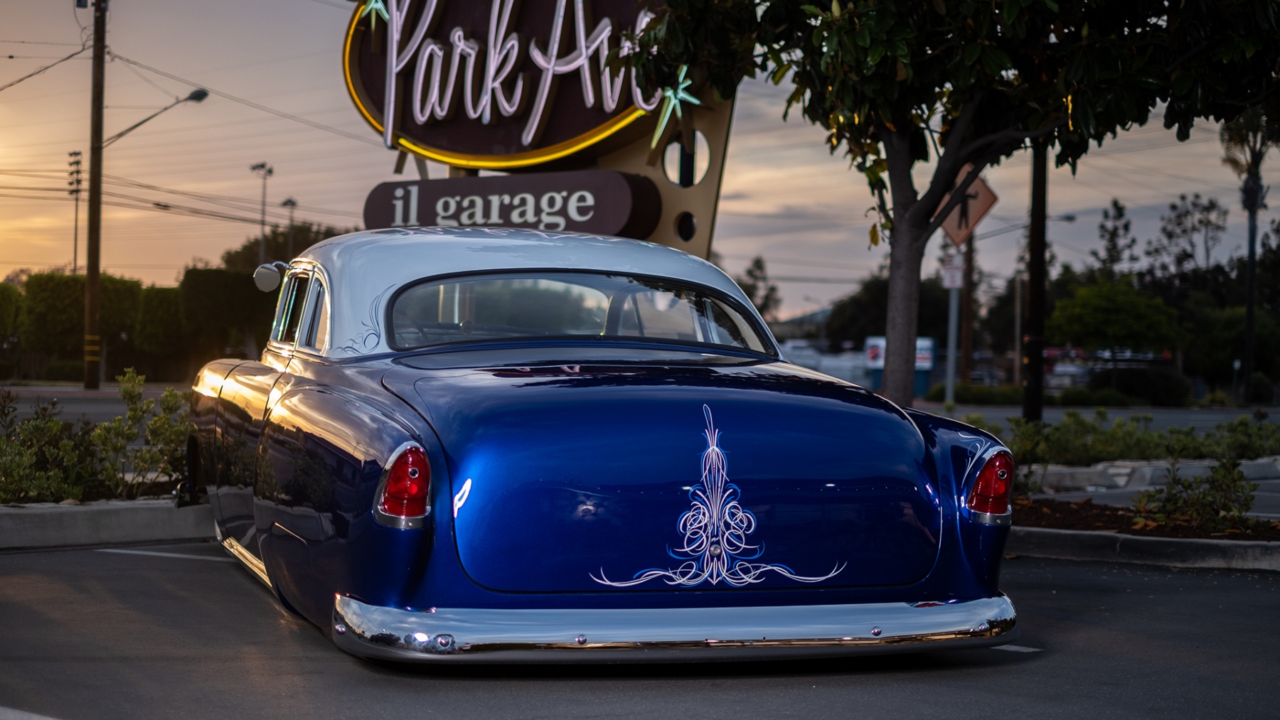 It was eight years ago when David bought this car off a craigslist ad. The condition was good and solid, no rust but it was all stock with 14” Astro Supremes. Not quite the 1950’s traditional custom look he was going for. Not long after that he reunited with his cousin Jose Campana’s family and his car club “The Dead Sleds”. Merc John from Riverside proceeded to chop the top 3” and shaved the emblems, mouldings etc. They peaked the hood, frenched the headlights and massaged in some 55 Chevy 210 taillights.