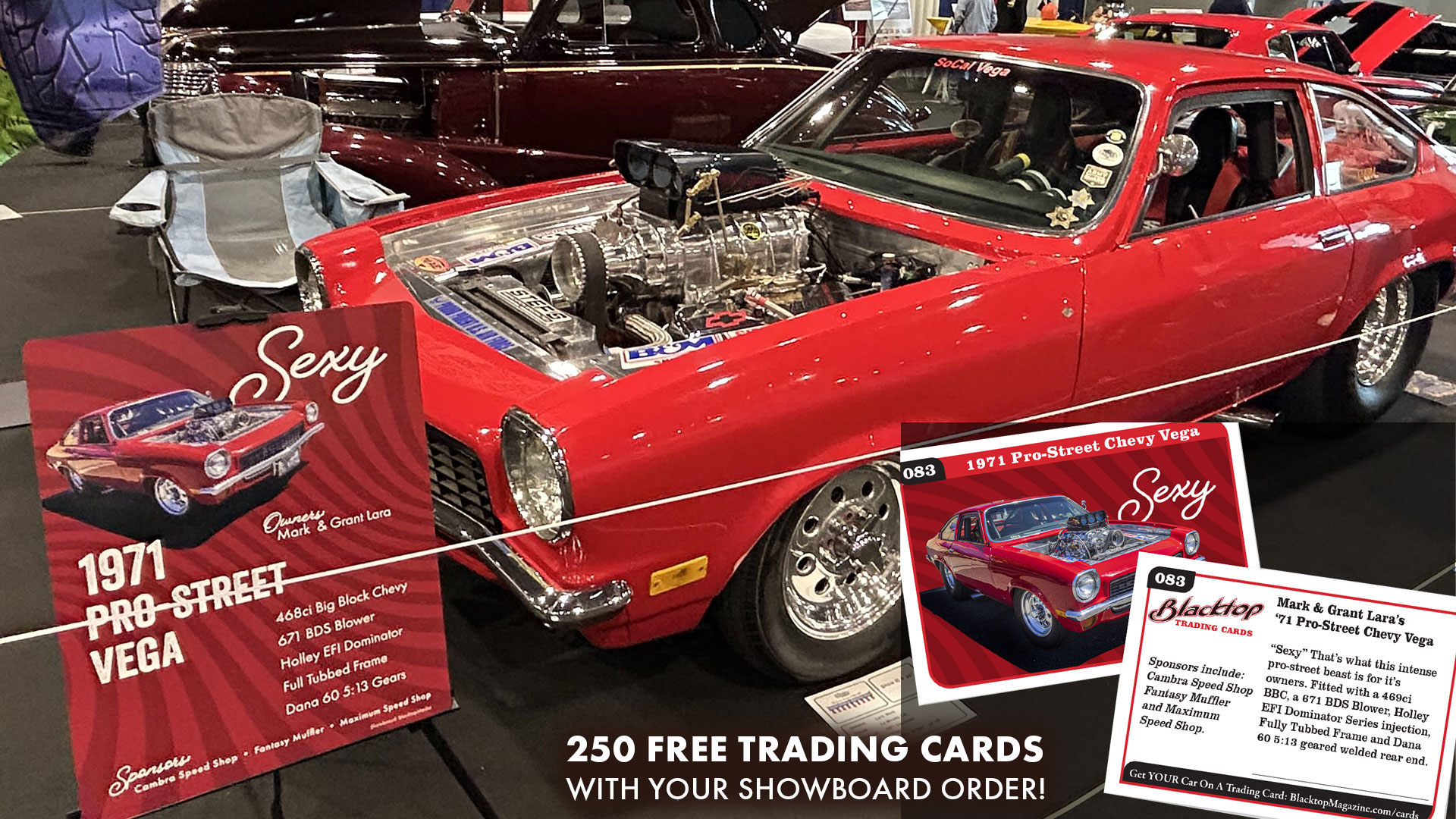 Offer includes a specially designed 18″x24″ Showboard printed on aluminum panel with rounded corners with an adjustable easel and a box of 250 Blacktop Trading Cards of your car! All for $300 plus tax and shipping! Place your order by emailing TonyC@BlacktopMagazine.com today! Be cool like Mark Lara and take advantage of this offer! Offer good with order placed by March 2026. We need 2 weeks to design and print your showboard and cards.