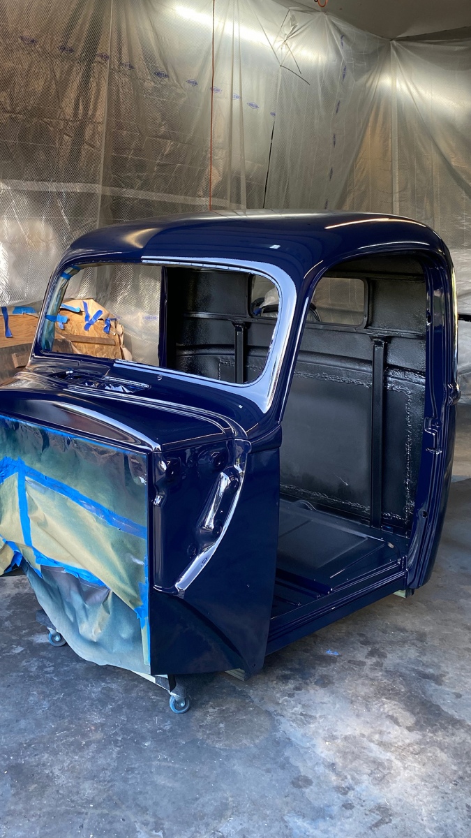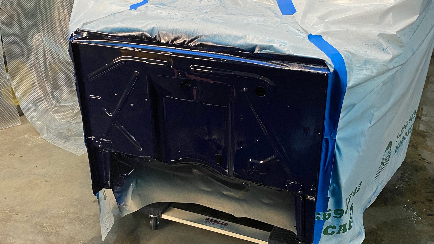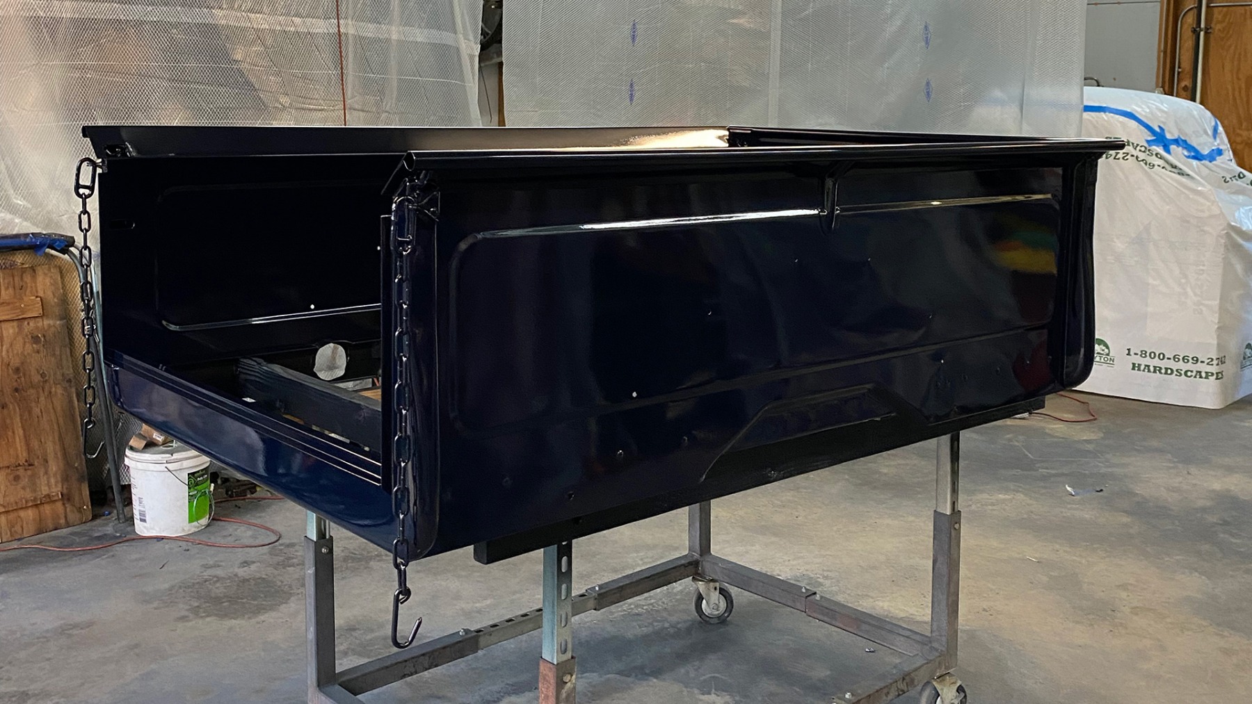 As you can see in the pics, they painted a few pieces at a time throughout the summer and are getting ready to re-assemble the truck. They painted it a rich dark blue hue that looks like a million bucks to me. When all the pieces are together they match very well. This is hard to do, especially with this hue where under different lighting conditions it looks to be more black, or brighter blue. They used a color matching light that mimics sunlight to get a true reading of the color.