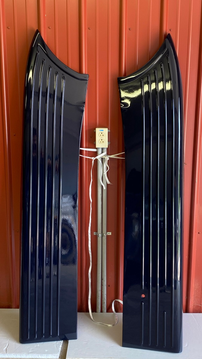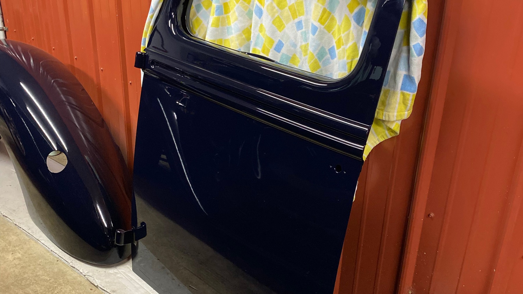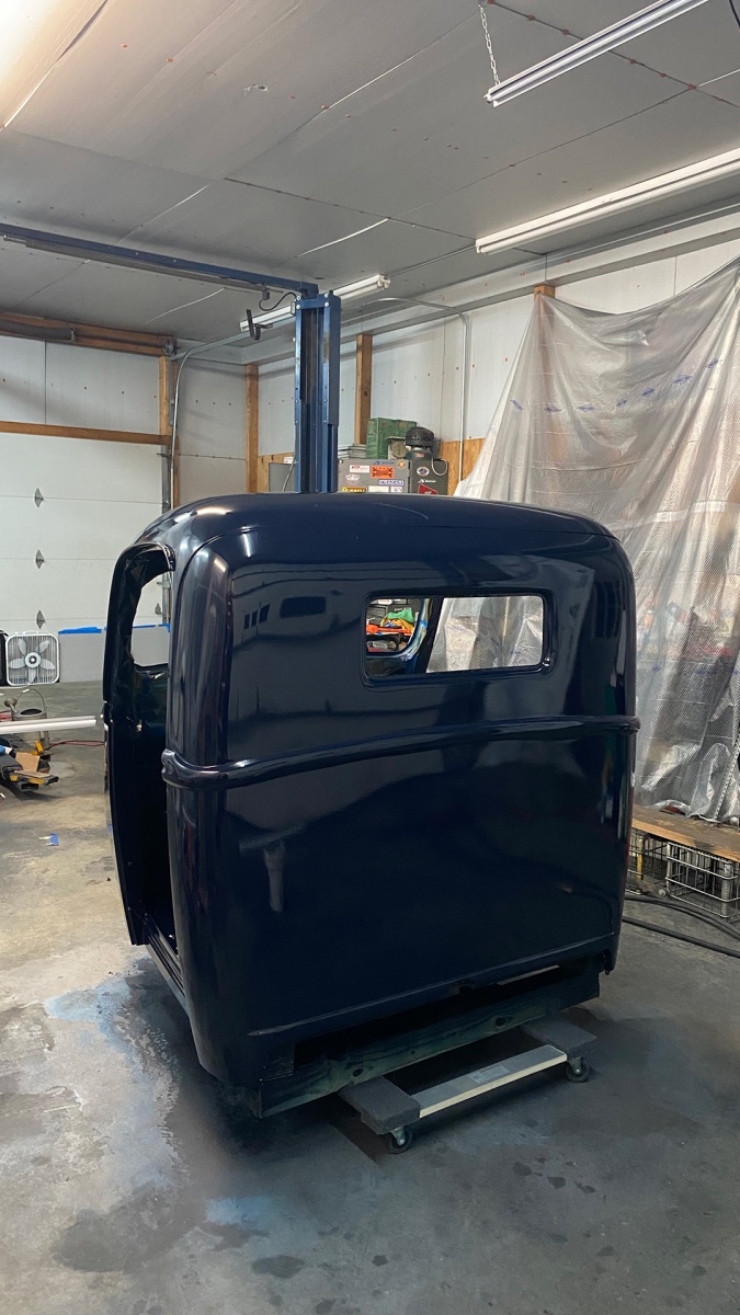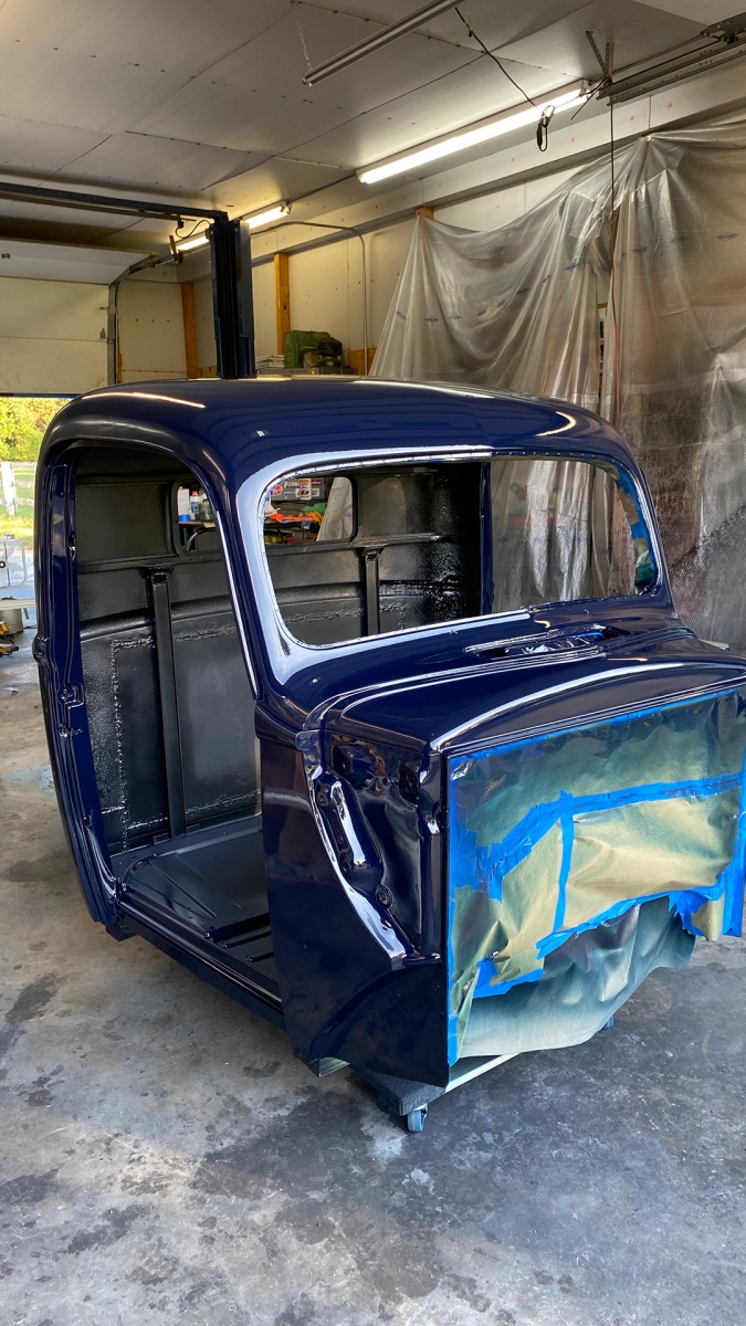 As you can see in the pics, they painted a few pieces at a time throughout the summer and are getting ready to re-assemble the truck. They painted it a rich dark blue hue that looks like a million bucks to me. When all the pieces are together they match very well. This is hard to do, especially with this hue where under different lighting conditions it looks to be more black, or brighter blue. They used a color matching light that mimics sunlight to get a true reading of the color.