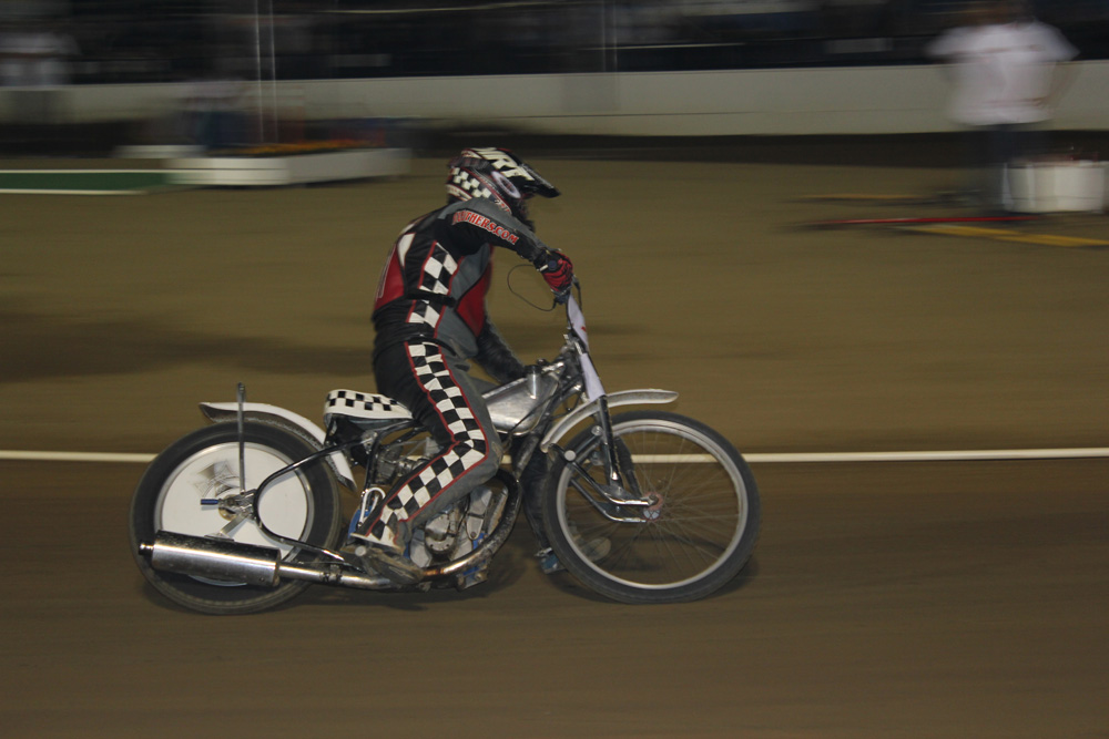 Just to let you know, Speedway Racing is 500cc motorcycles running counter-clockwise around a flat dirt track. Usually four racers per 4 lap race. They slide the bikes sideways with their bars crossed-up around the turns. Speedway Sidecar Racing is 1000cc sidecar rigs going clockwise around the same track. Both styles have NO brakes. Before the riders take the course, they choose a golf ball with the lane choice marked on them.