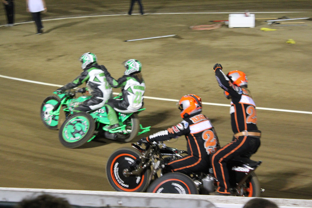 Can you smell that? We got a whiff of the methanol as we get closer to the Orange County Fairgrounds in Costa Mesa, CA this Saturday afternoon. We are on our way to Harley Night at the Costa Mesa Speedway. First of two such events in the calendar and as an added bonus it’s Sidecar racing too.