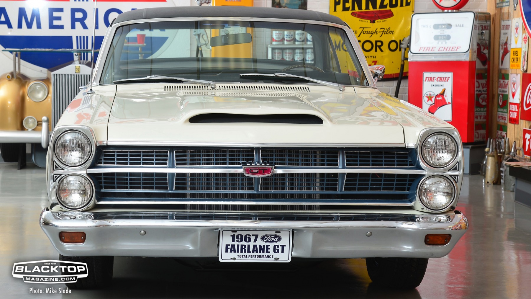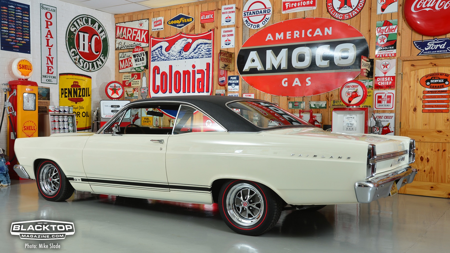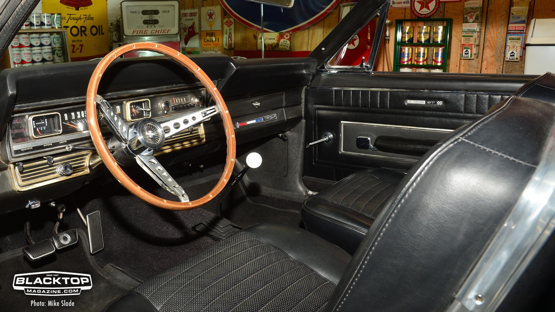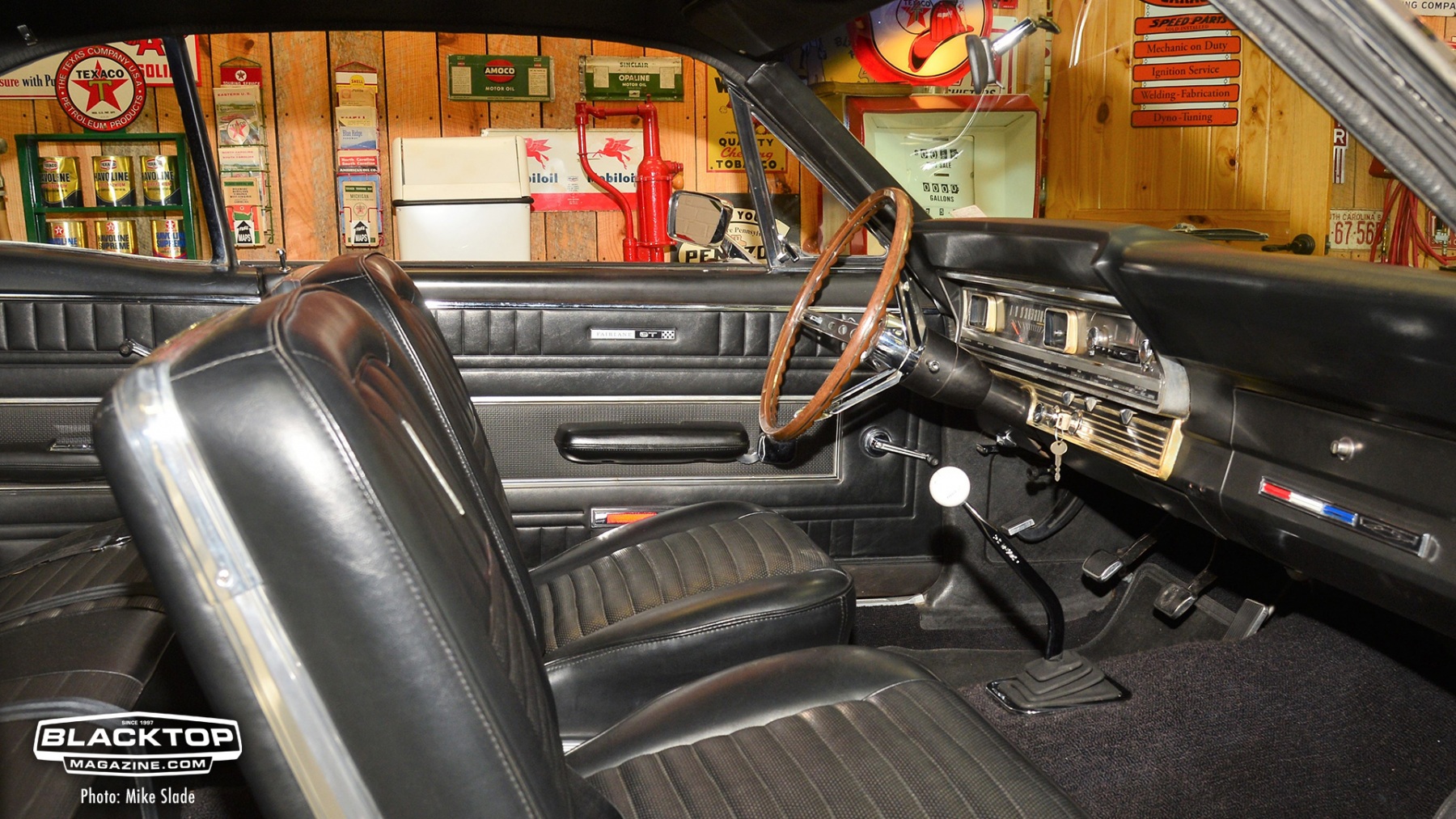 The vinyl top and nicely appointed interior give this street beast a touch of class. The car definitely has that sleeper look until you see the Fairlane R-Style fiberglass hood.
