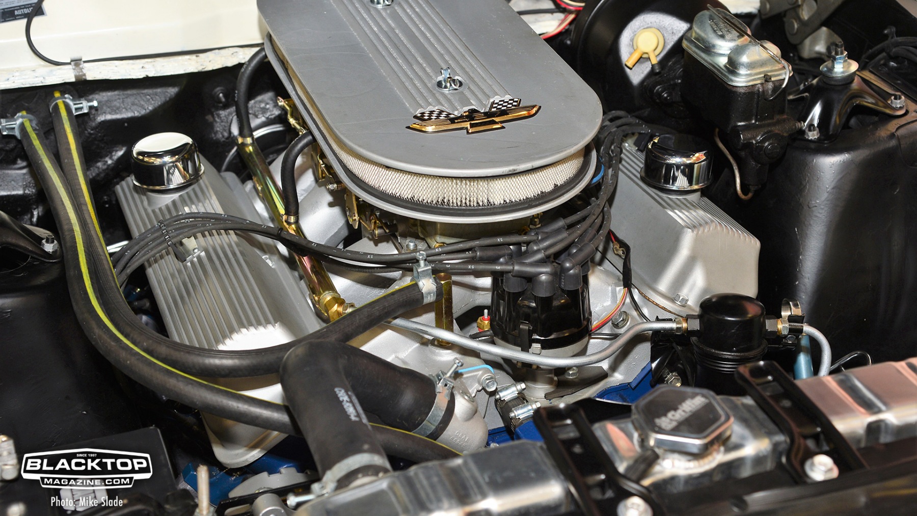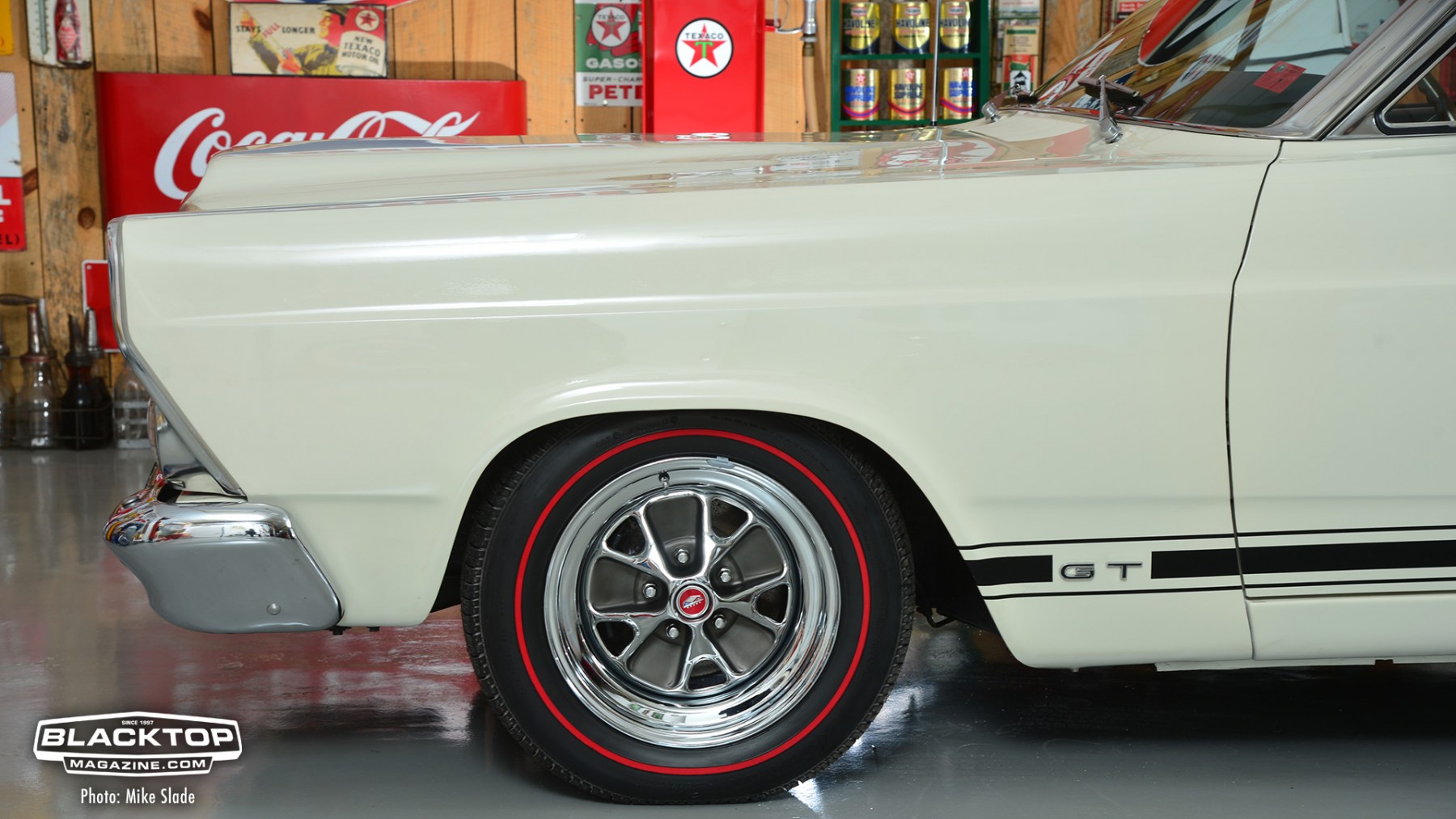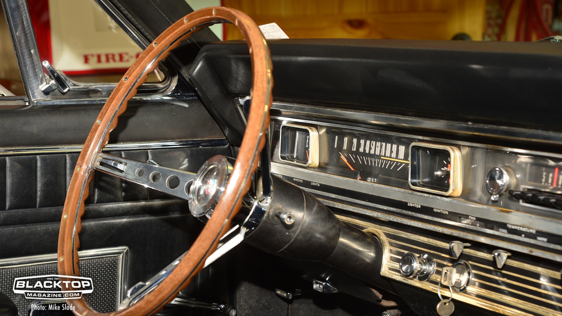 The engine was a Holman/Moody 427 that was stroked out to 454ci using a 428 CJ crank, forged pistons H/M Camshaft, Holley BJ/BK 2x4bbl set up nto a tunnel wedge intake manifold. Exhaust is expelled through custom x-pipe crossover and Flowmaster mufflers. A top-loader 4-speed manipulated by a Hurst Competition plus shifter links to a 3.91 geared limited slip differential. All that is suspended on leaf springs with KYB shocks. Out front featured Eaton Detroit Coil-over springs and 1″ Heavy Duty sway bar, Scott Drake lower control arms. 15×7 Styled Steel Wheels with American Classics Redline tires finish off the drivetrain.