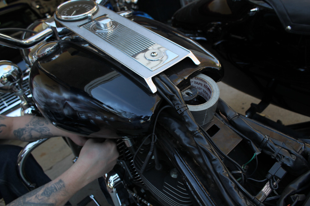 - Remove seat and lift the tank. We found it helpful to turn the bars a bit to help raise the tank enough to stick a roll of duct tape under the back of the tank to hold it at the proper height.