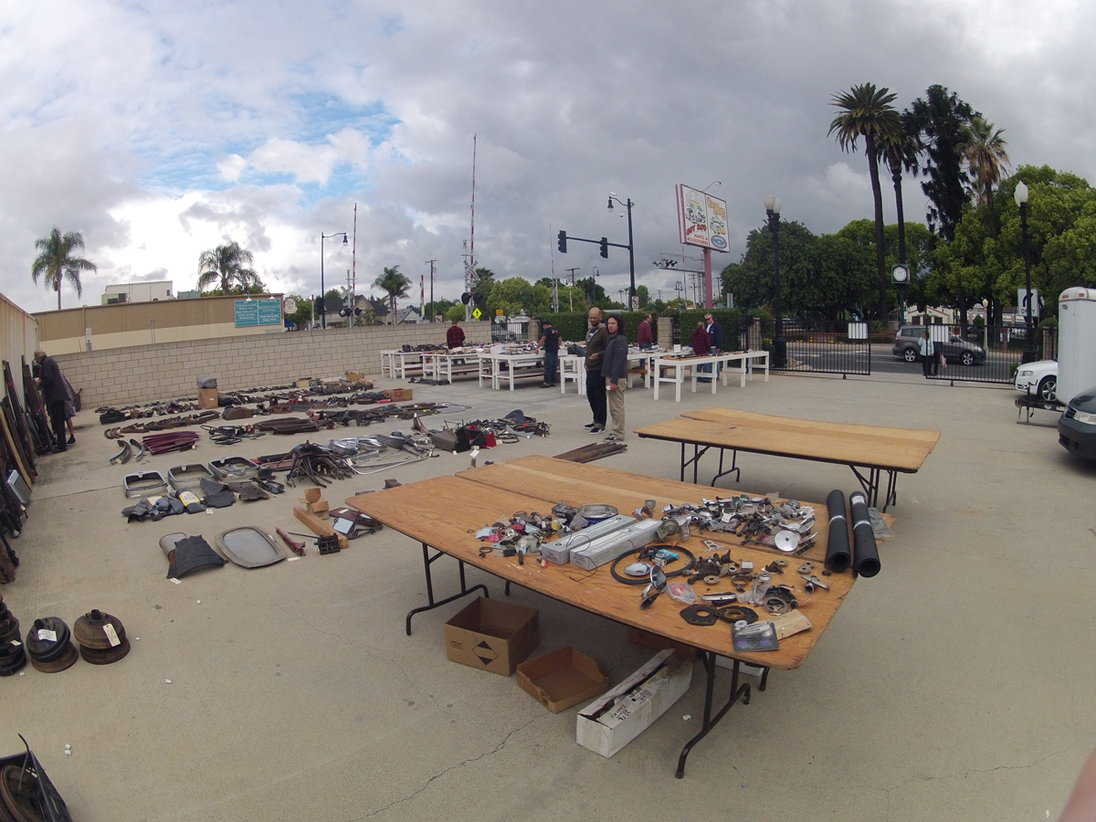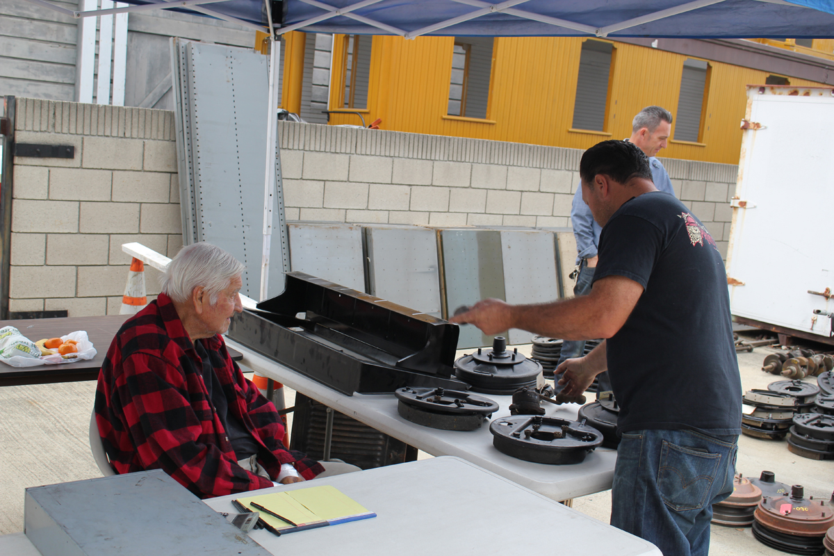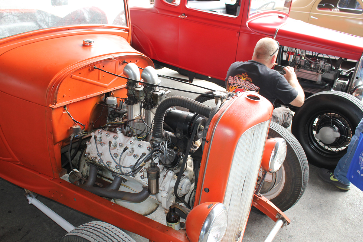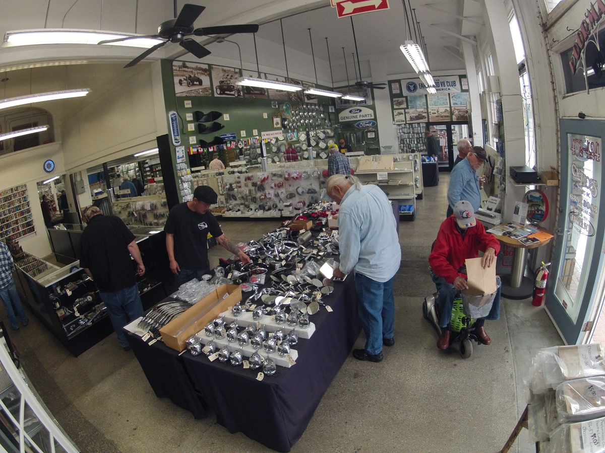 An added benefit this year was an incredible parking lot sale at the historic C.W. Moss building only a mile away from the park. C.W. Moss is an internationally recognized early Ford restoration parts retailer. The patriarch of the family run business; Harold Looney, was there to meet his old time friends who visit come from all around for the show in the park. Just as the breakfast was ending, and the visitors rolled up to C.W. Moss, the clouds decided to let the rain fall. More diehards didn’t mind the rain while shopping for great deals on take-off and New Old Stock Ford parts.