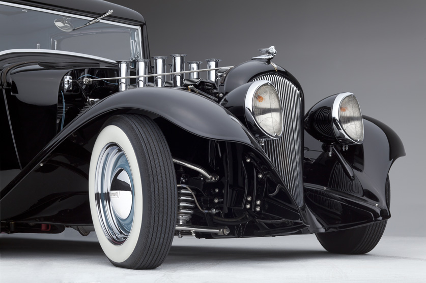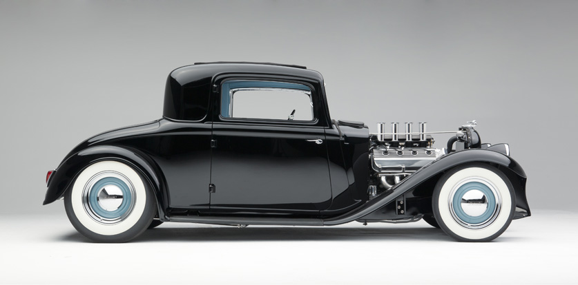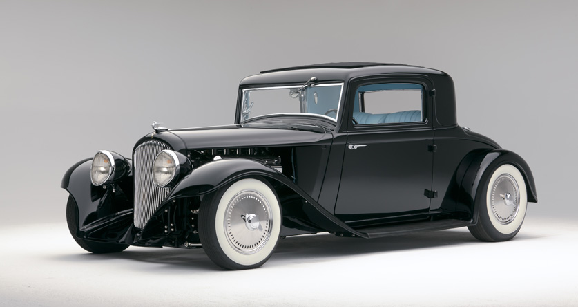 - original 1932 PB Coupe by Plymouth, PPG Black with a 5” channel, Custom slide back top, Extended and reshaped rear fenders with 1941 Plymouth tail lights, re-shaped front fenders with custom built support brackets, 1933 Chrysler Imperial “Flex Beam” headlights modified to fit original stands Chopped and sectioned original grill and shell