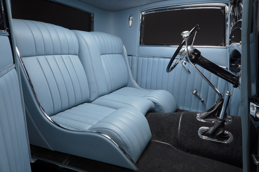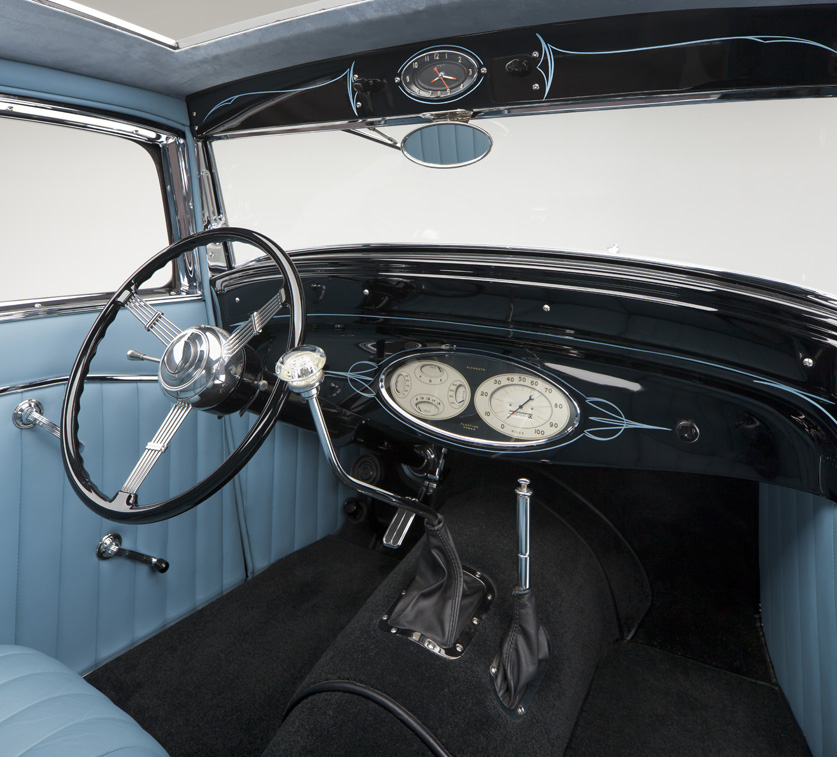 - Original 1934 Plymouth dash cluster by Classic Instruments, 1955 Olds clock, 1951 Shoebox pillar lights, power side windows, power rear window Ogden Top and Trim custom built bench seat, blue leather with Blue suede headliner. Rad Rides by Troy Custom build speaker covers, gas and brake pedals with custom door and trunk sill plates. Alpine custom sound system, XM satellite radio, ipad/iphone connect all hidden in rear panel compartments.