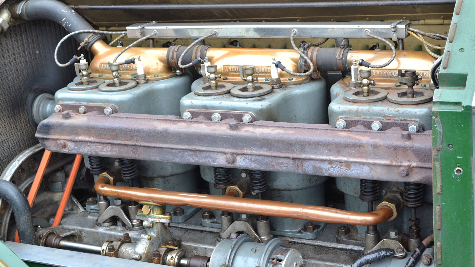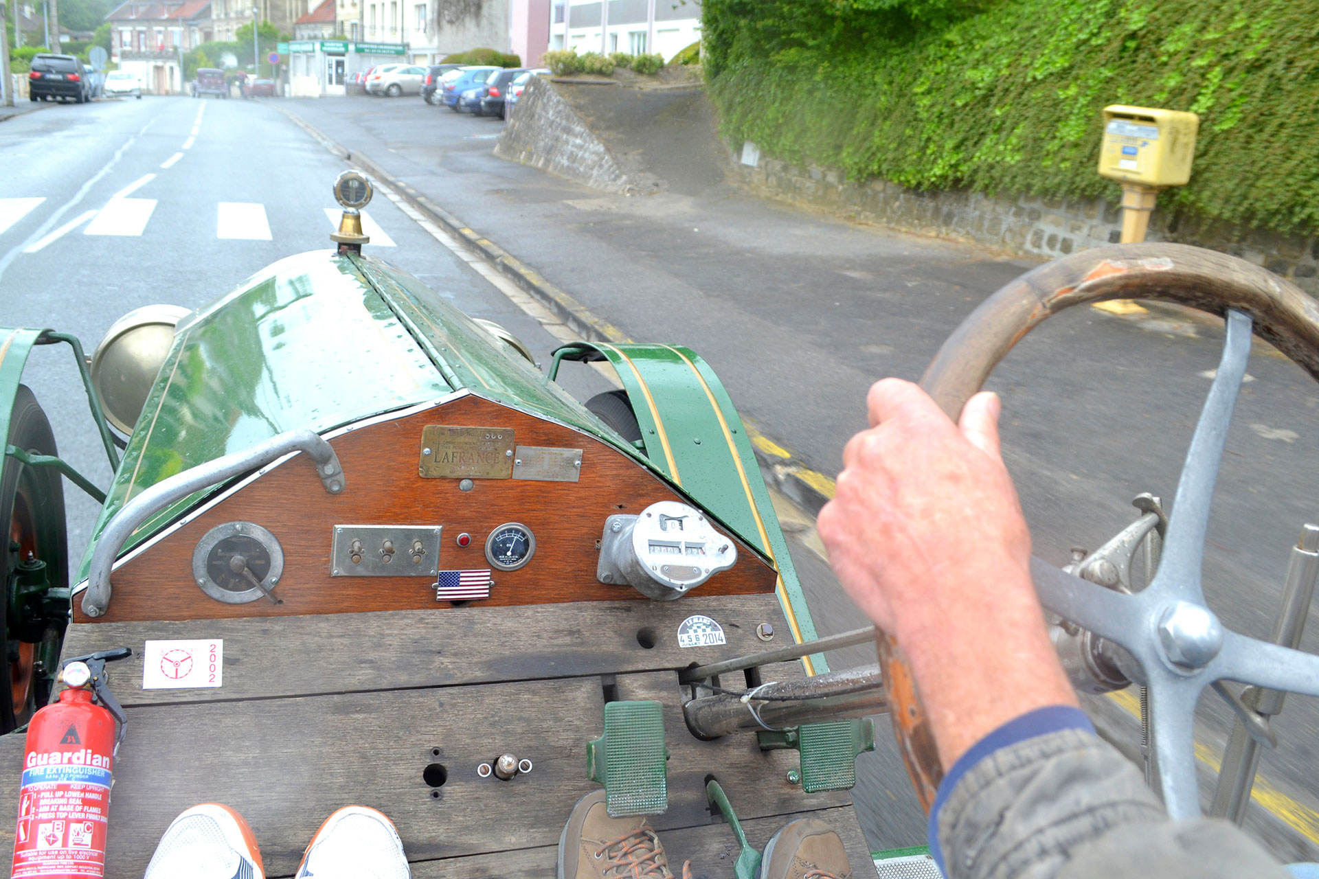 The earlier La France trucks had a $5k purchase price ensuring most of these machines would remain in standard form for many years and built with such a robust quality many continued their fire-fighting duties for decades. These earlier chain drive models from the marque based on the Simplex design were still being produced over twenty years after La France supplied their first customer. Thereafter many would remain in fire truck spec for years with enthusiasts preserving their originality whilst others would be converted, often when they were well passed pensionable age. The longest endurance events, such as the Peking to Paris, nearly always feature a La France and it takes a certain passion to own and maintain such a vintage of machine whilst understanding the ingenious engineering that is now a century old; one such man is Julian Grebby. Reasonable knowledge is required just to get a 100 year old engine of this size to fire; time for me to listen and learn. Fuel on followed by primary and secondary ignition. Decompress the exhaust valves followed by an offer of £50 if I fire her up on the starting handle, I declined. When facing a cold start thimble sized cups sit on top of the cylinders, one shot of fuel into each and a turn of the brass handle drops the extra measure into the bores. A starter motor the size of a small bucket spins the huge iron flywheel and produces a strange grating noise common with these engines, then with a roar that is guaranteed to make you jump, six pistons each big enough to accommodate a grown man’s hand are forced into action. My first sighting of the Type 12 from 1914 was appropriately at the Laon Classic Festival in Northern France. The La France was many spectators ‘star of the show’ whilst blasting around the closed roads of the old town. The offer to view the town and acknowledge the crowds from the passenger seat of this ‘green goddess’ was a chance for me, not to be missed and never forgotten.