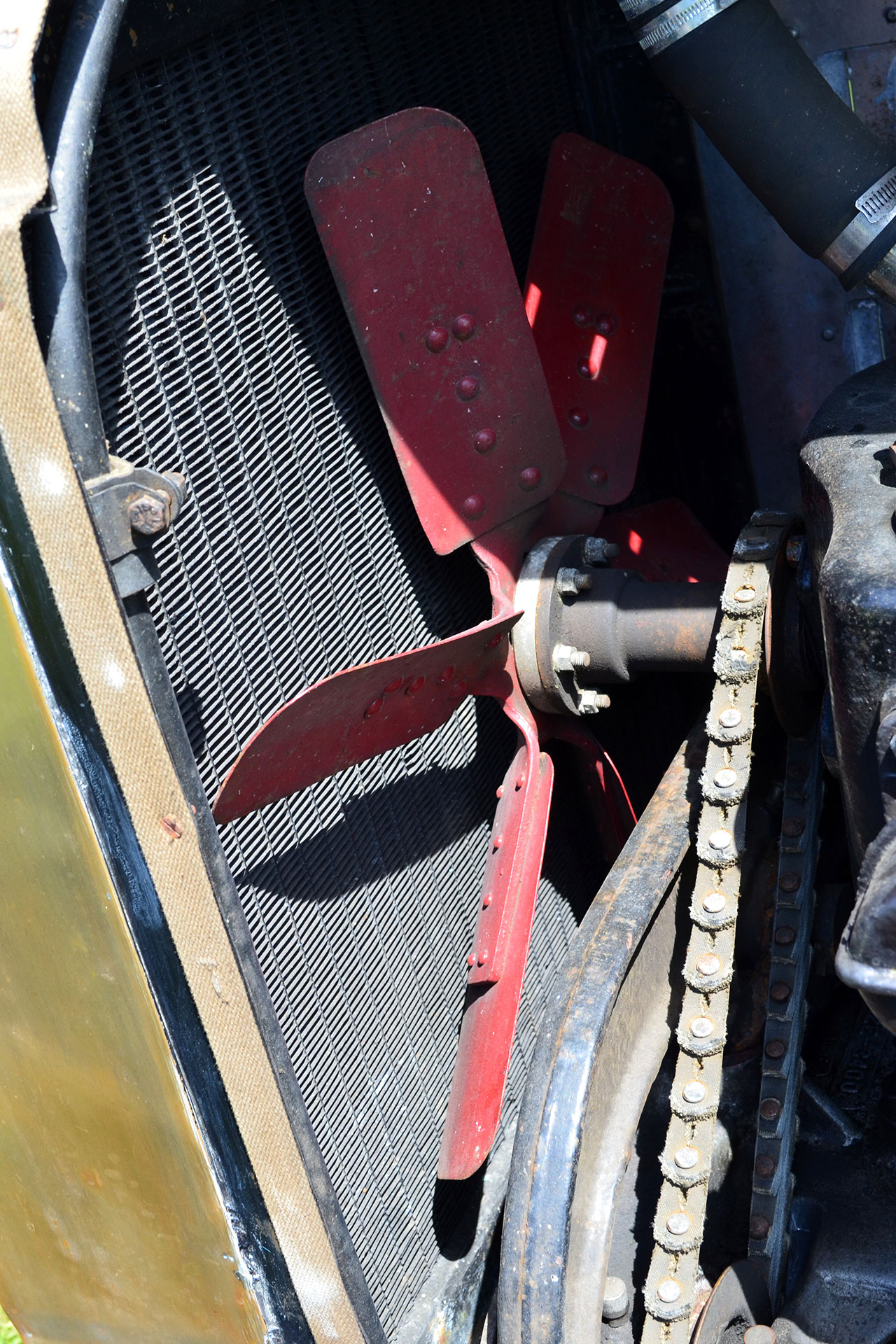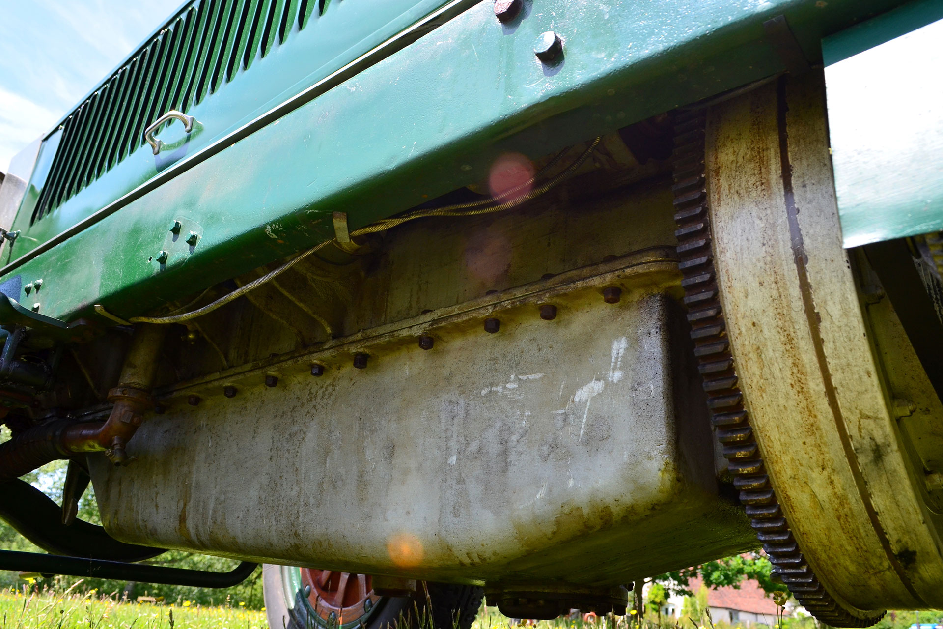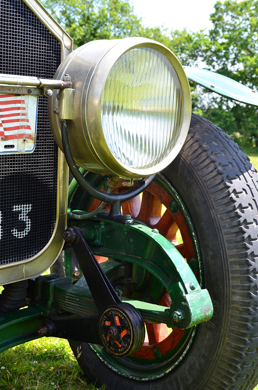 Meeting up with Julian again at his home in Kent offered the chance to understand the La France, quiz the custodian and admire another Speedster from the marque; yes he has two. Both Type 12 versions but yet quite different, for this reporter Christmas had arrived early. Julian began his interest in La France with an original fire truck complete with ladder and additional lighting. Imported from Tom Laferriere in the States this 1918 vintage was ‘too nice to convert’ Julian divulged, so his only option was to look for a converted example. A trip to Brooklands Auction provided the solution with his first Speedster. Later he was given the opportunity to purchase the 1914 machine which offered all he wanted in a La France; the fire engine was sold. They share the same power unit although both have enjoyed some sympathetic alterations including alternator conversions using the flywheel as belt drive. The green car I enjoyed in France is dated 1914, has a more pronounced Speedster look and with its slightly shorter chassis sits much lower than the later 1918 machine from Julian’s stable, height reduced by the 24in rims. The later alloy bonnet version runs 26in wheels and is fitted with a Zenith Carburettor whilst the green machine is fuelled by a Schebler version; an Indianapolis company that later became Borg-Warner. Mechanically both cars share the components with the same T head motors and three speed gearboxes driving the impressive chains to the rear wheels. In true Speedster fashion the earlier version has also benefited from the weight shedding losing nearly a ton in the process. Visually there are noticeable differences, especially the height of the later car with the peak of the bonnet reaching 5ft above the ground. It runs open wheels whilst the earlier car has period mud guards and a pair of individual leather seats and the area over the dash from the bulkhead has been reduced. The earlier green car is certainly much more the ‘Speedster’ whilst the later version is even more imposing, winning the ‘mines bigger than yours’ contest with its huge alloy bonnet.