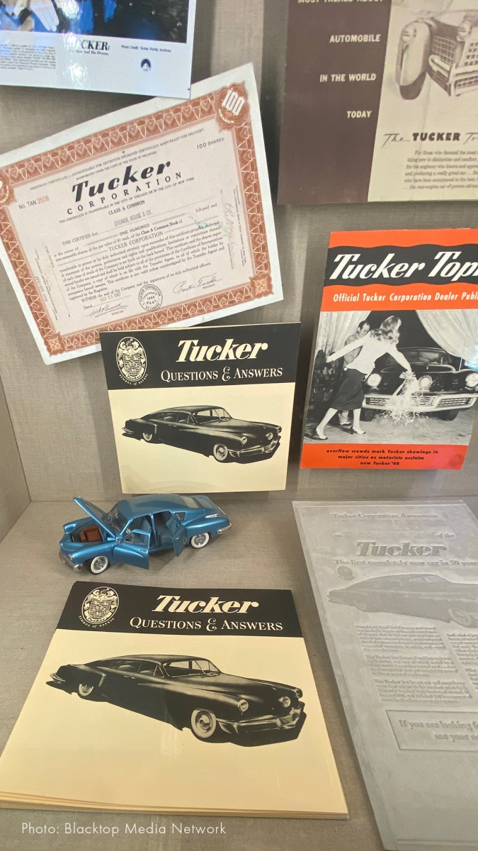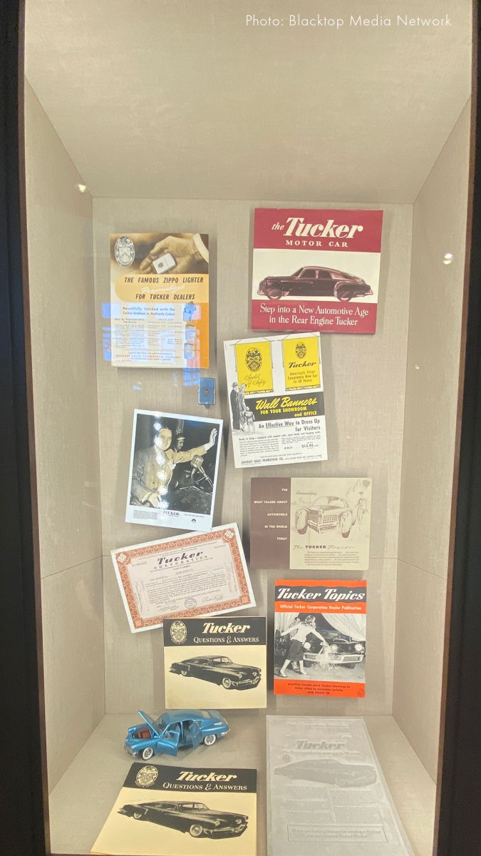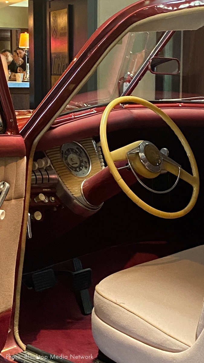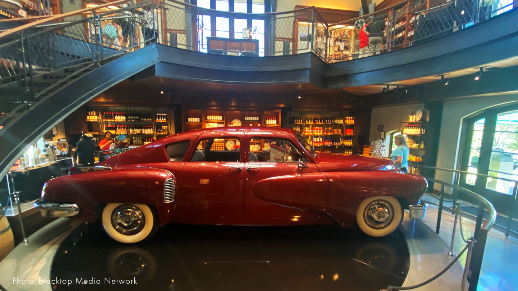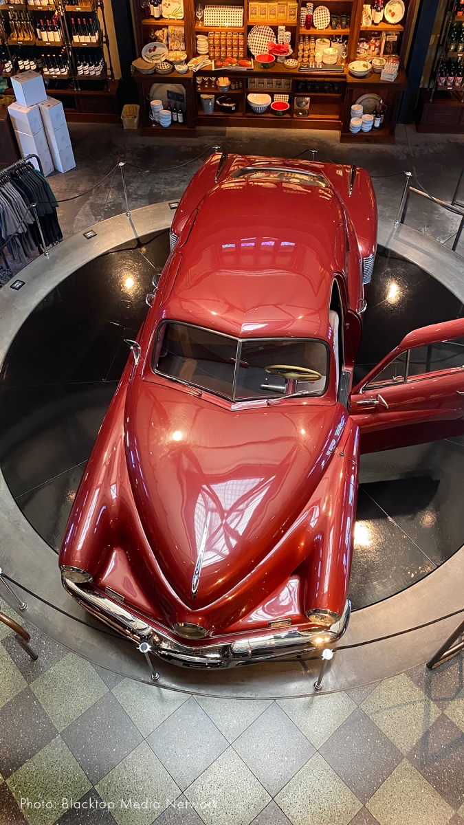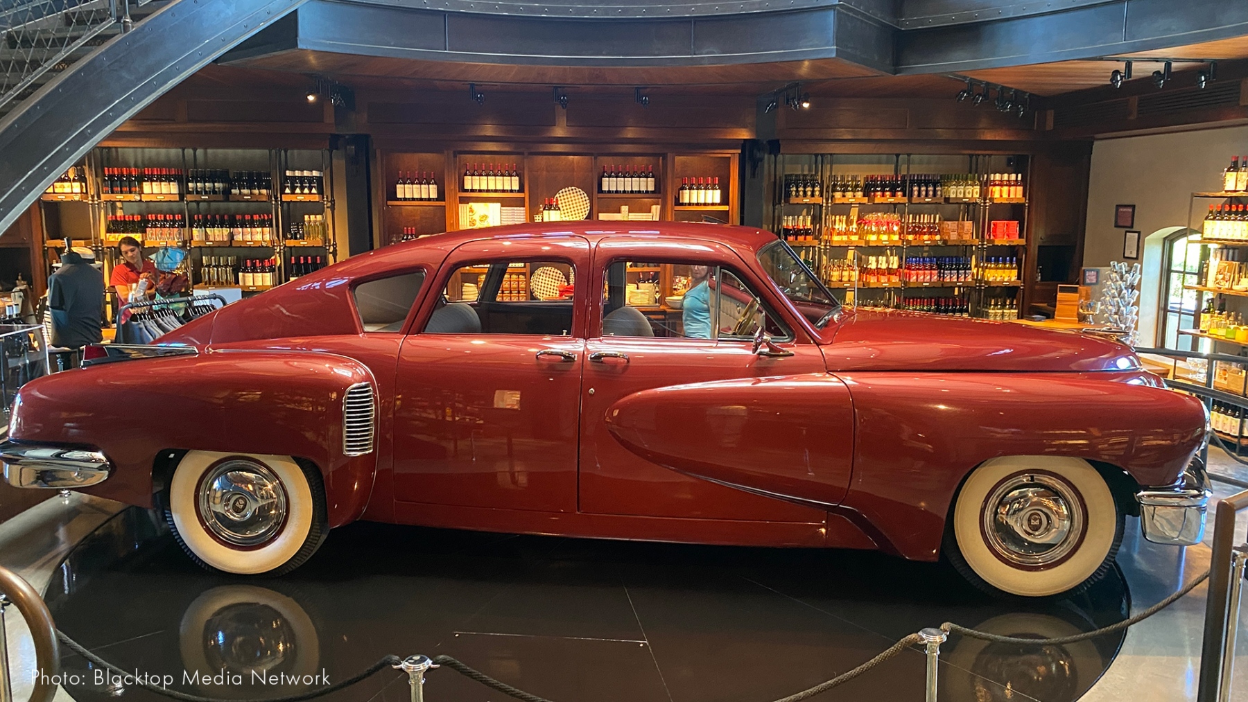 Then there’s another room, adjacent to the beautiful covered wine tasting patio. In the middle of this room is a large turntable with a beautifully lit Tucker 48 spinning ever so slowly. A curved staircase follows the car on the backside of the room from the french doors that leads up to a gallery of sorts, a library if you will, a display of more movie memorabilia. I walk up only to get another precious view of this historic jewel. Not only is it’s stunning design, but the car represents an entrepreneur trying to take on a post-war automotive industry that is gradually trying to build innovative cars instead of purpose-built war machines. Preston Tucker had the gall. The out right gall to try and create something so ahead of its time, so forward thinking that it turned the conservative establishment on its rears. This infuriated them so much that they conspired to have him stopped by cooking up legal shenanigans. Yep! There I said it! Who could ever imagine huge corporations would stop a little guy for showing them what innovation and creativity can do. And yet, here it is before me. Here it is live, in-the-flesh, right before my very eyes.