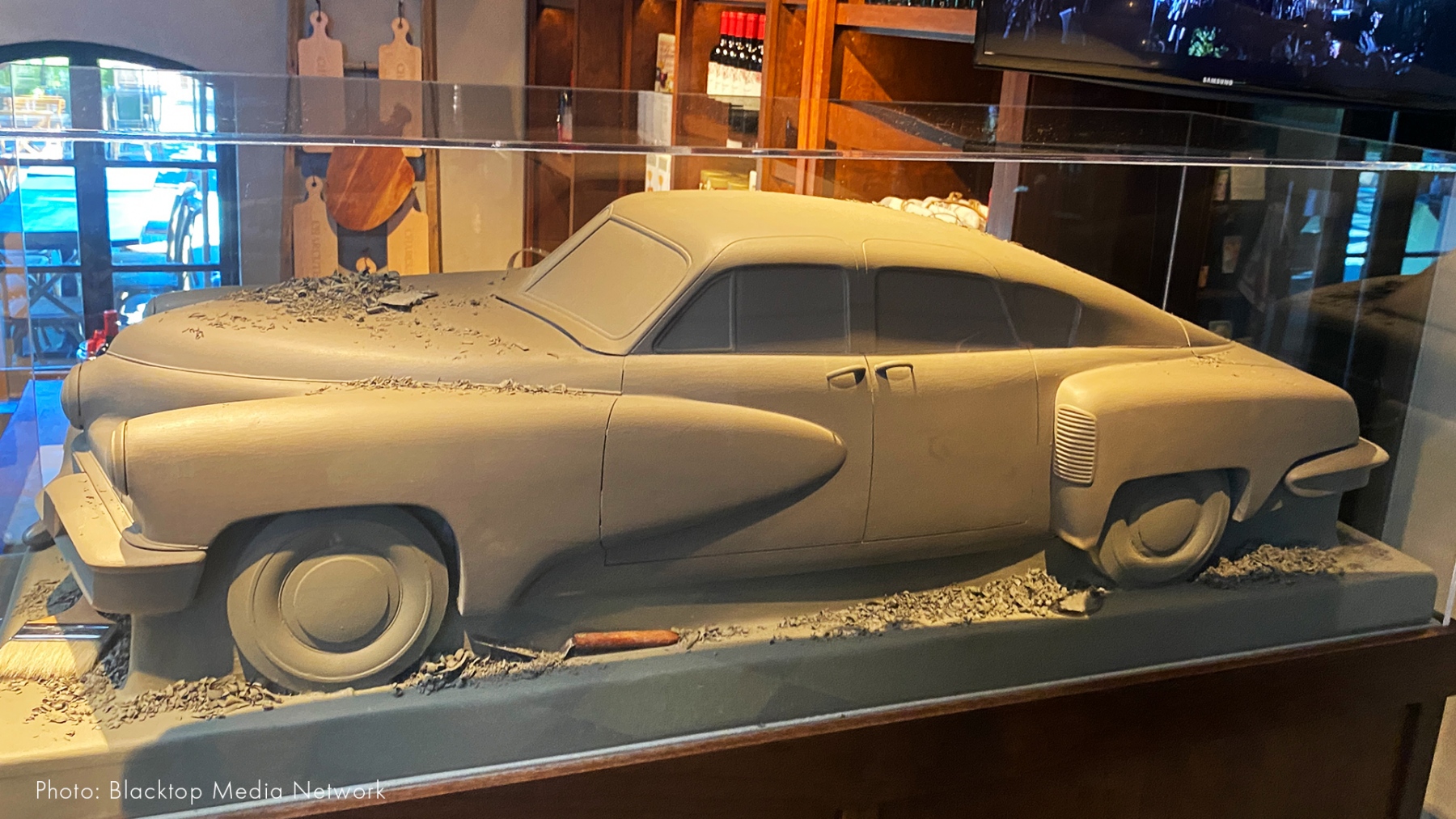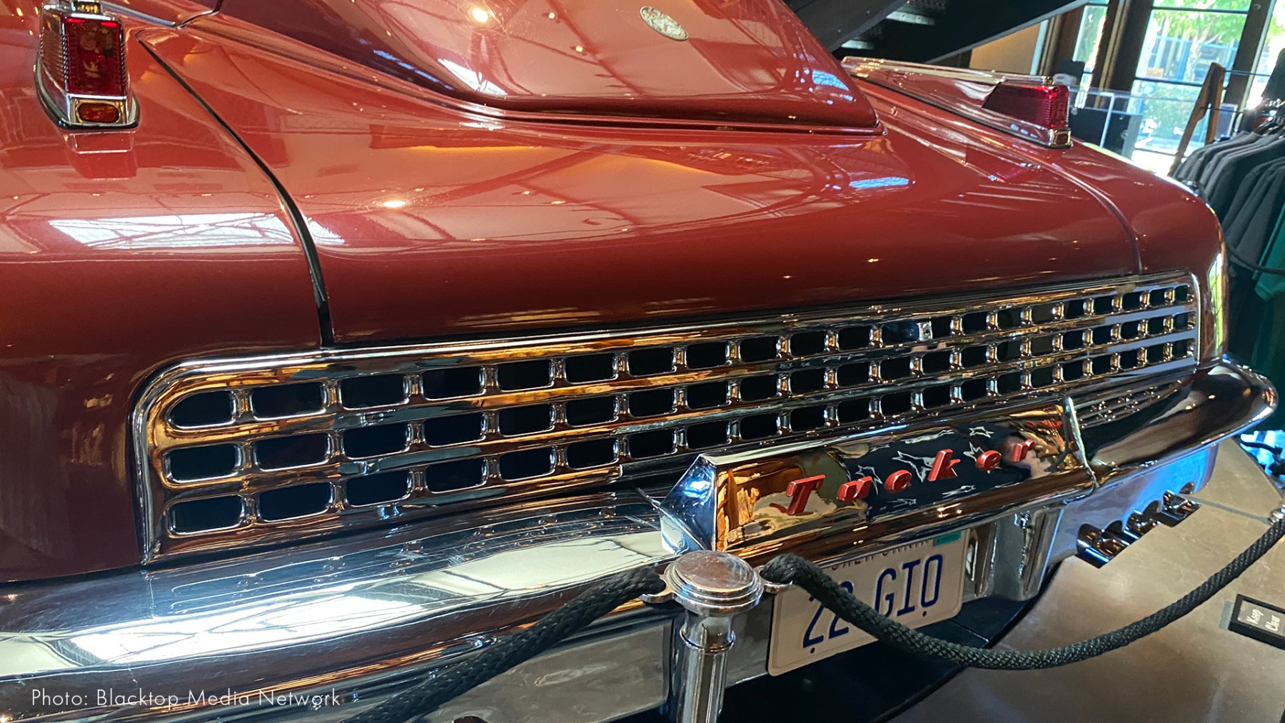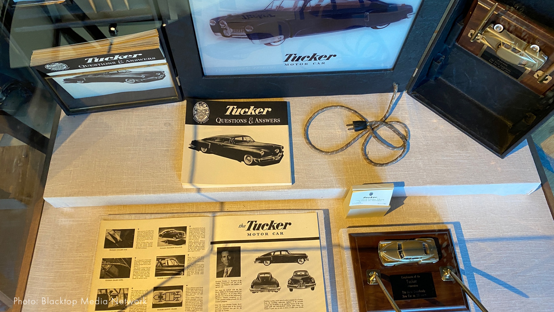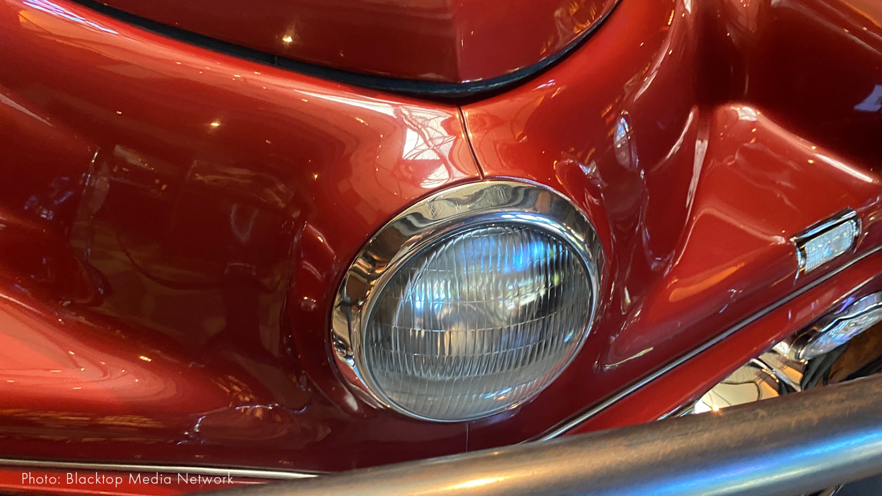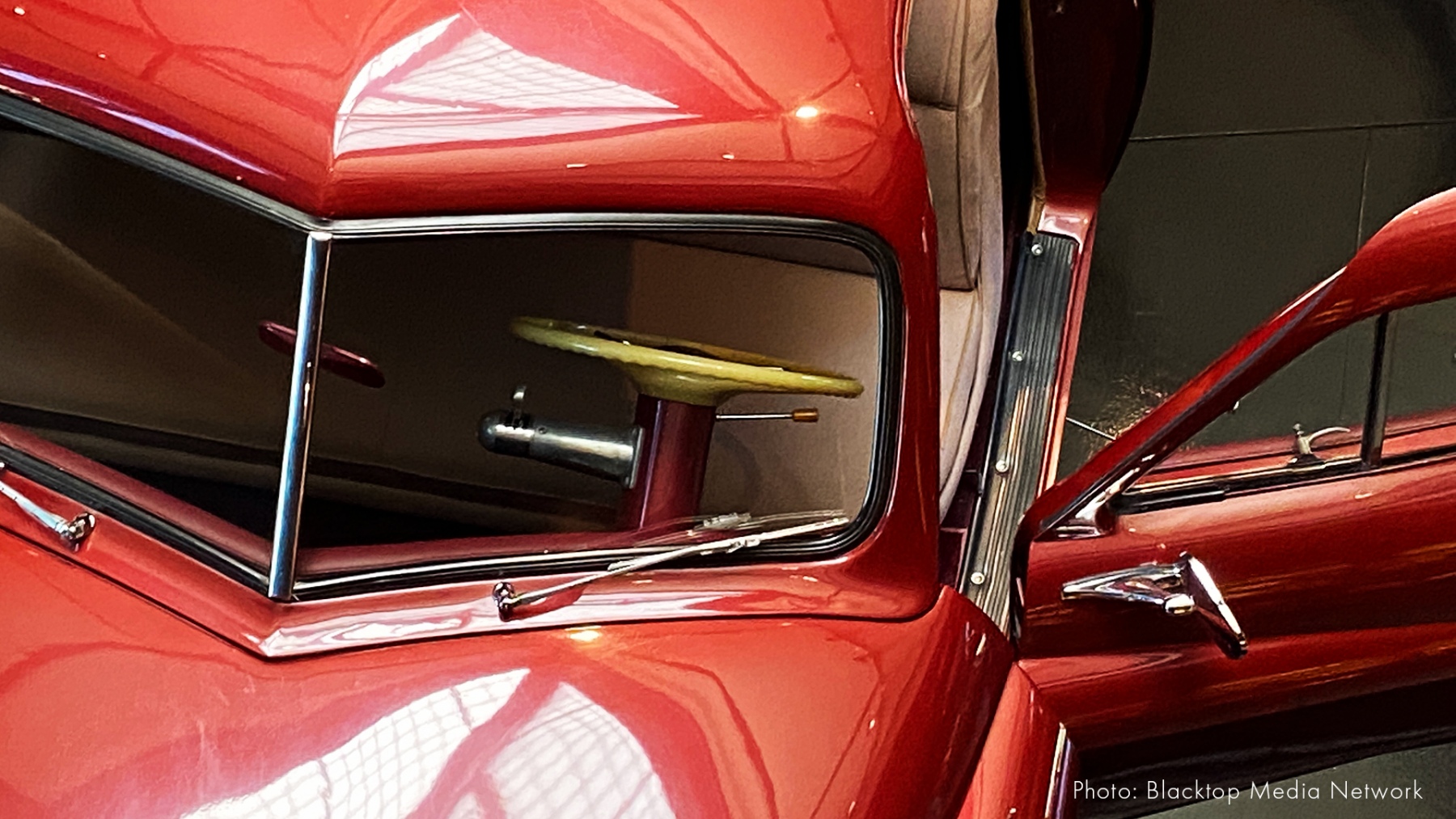 Then there’s another room, adjacent to the beautiful covered wine tasting patio. In the middle of this room is a large turntable with a beautifully lit Tucker 48 spinning ever so slowly. A curved staircase follows the car on the backside of the room from the french doors that leads up to a gallery of sorts, a library if you will, a display of more movie memorabilia. I walk up only to get another precious view of this historic jewel. Not only is it’s stunning design, but the car represents an entrepreneur trying to take on a post-war automotive industry that is gradually trying to build innovative cars instead of purpose-built war machines. Preston Tucker had the gall. The out right gall to try and create something so ahead of its time, so forward thinking that it turned the conservative establishment on its rears. This infuriated them so much that they conspired to have him stopped by cooking up legal shenanigans. Yep! There I said it! Who could ever imagine huge corporations would stop a little guy for showing them what innovation and creativity can do. And yet, here it is before me. Here it is live, in-the-flesh, right before my very eyes.