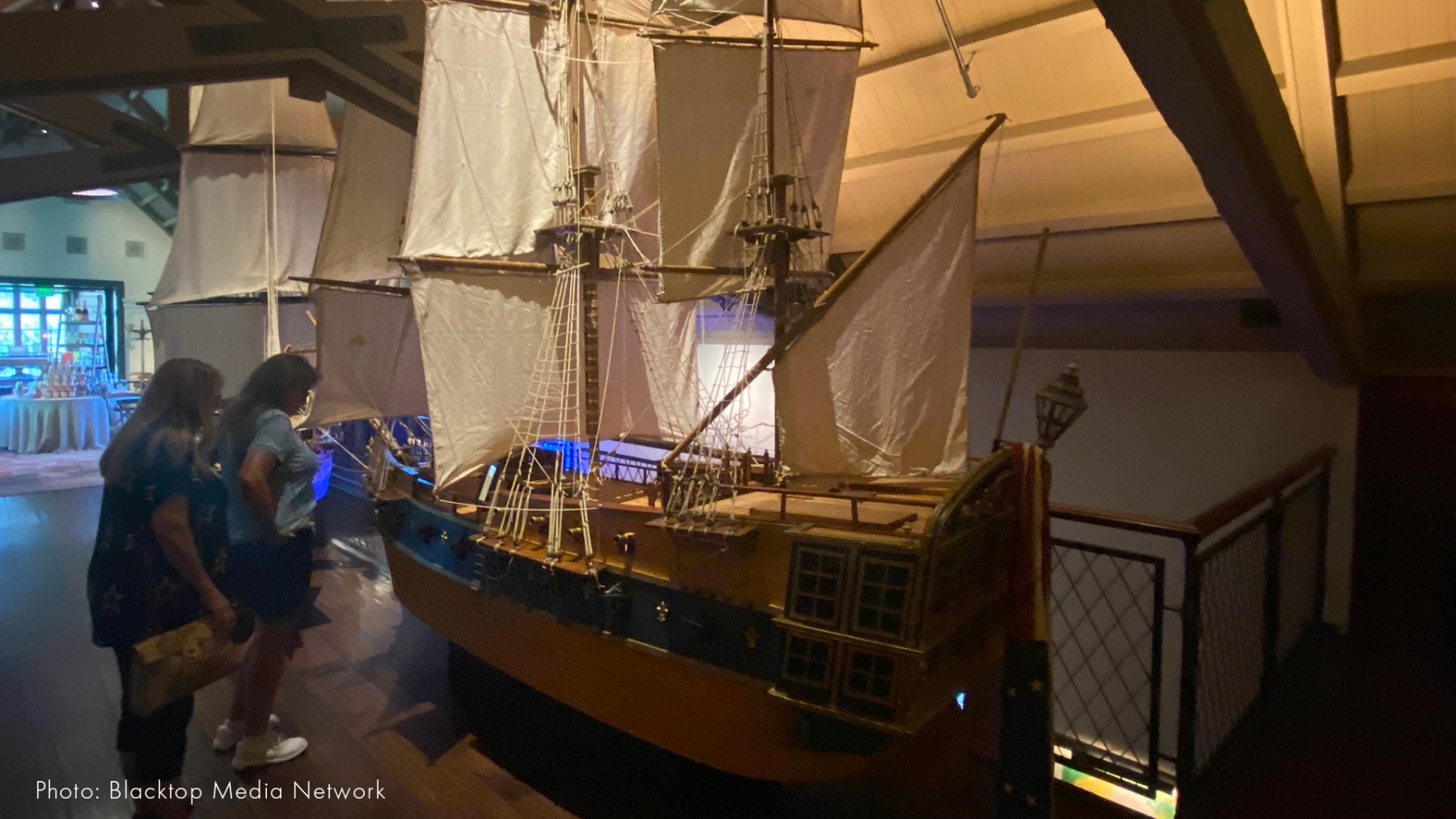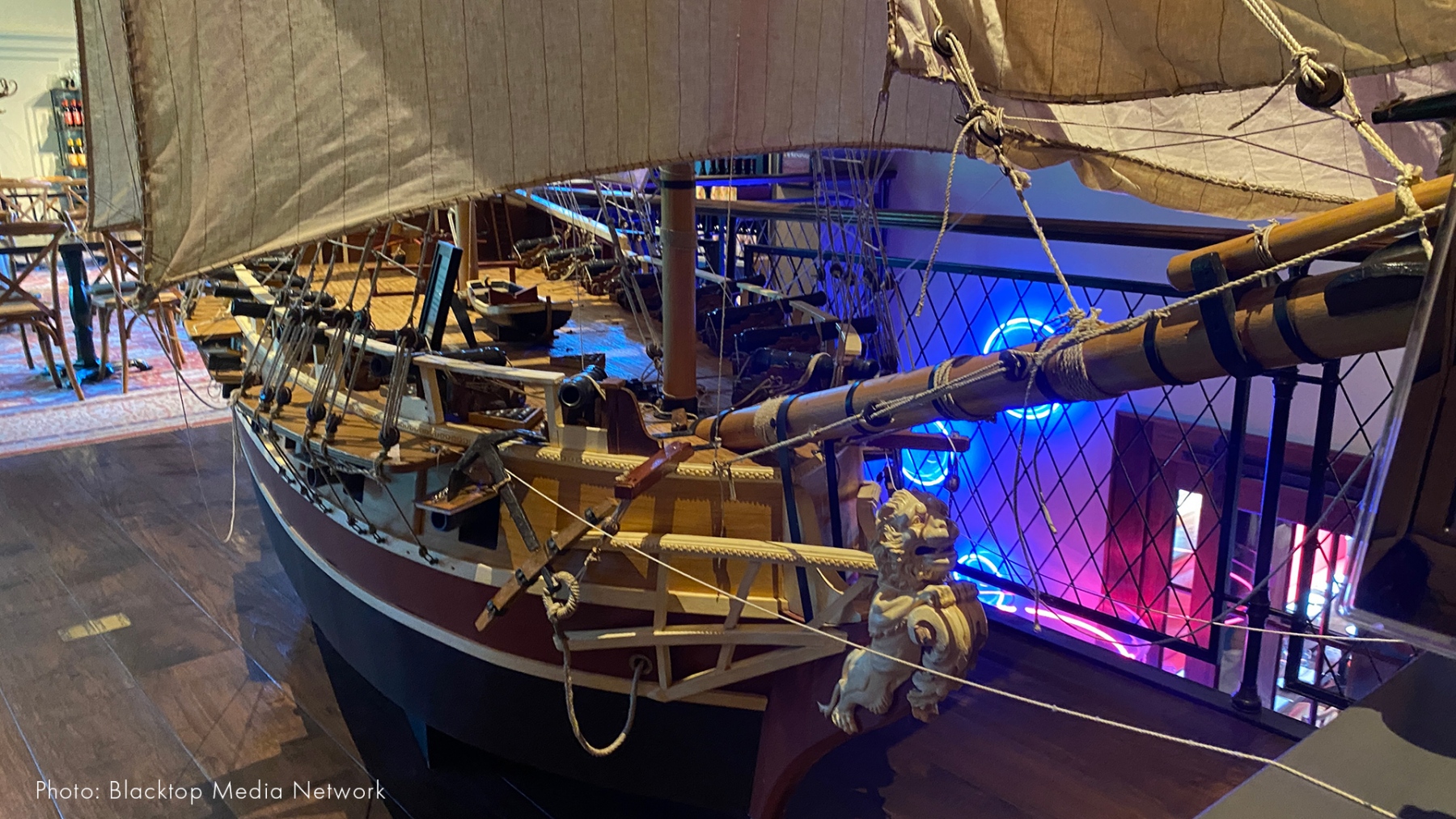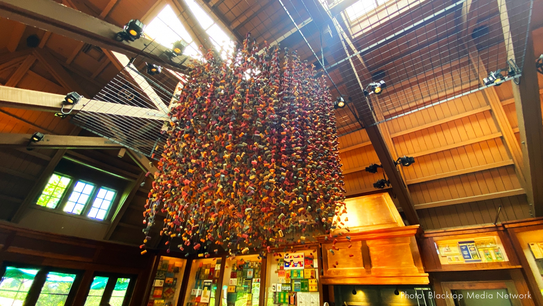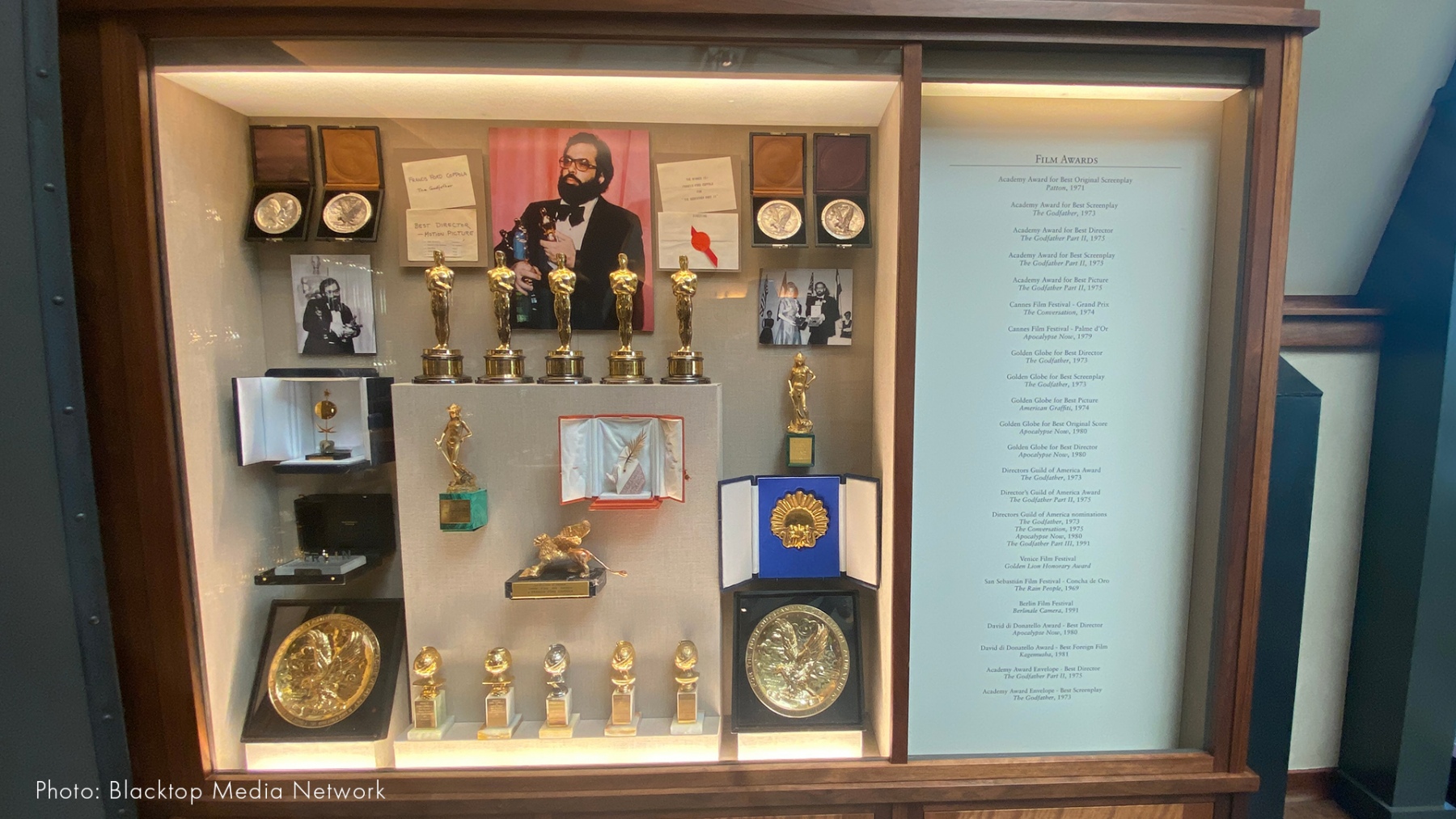 That’s what this recent trip was like. We drove up a short street right off Hwy 101. Geyeserville has maybe two exits, about an hour and a half north of San Francisco. When you take this one lone exit heading north, you go left and cross under the freeway and right up to the gates of the Francis Ford Coppola Winery. Nice pulverized granite parking lot gives the guest an immediate sense of being in the country. A large rock structure stands in front of us as we direct our way up the steps to the entrance of a beautiful courtyard with a deep blue swimming pool to our right and wonderful wood doors and wisteria covered patios to our left. A huge sculpture of colorful wine corks dangle from the ceiling on nearly invisible lines. The dappled light through the sky lights above create a wonderful theatrical moment as you move through the space. Each room has displays from movies that Coppola either directed, produced or wrote. A case with his Oscars for The Godfather, costumes from Bram Strokers Dracula and even, two large scale model ships from his daughter Sofia’s 2006 film Marie Antoinette.
