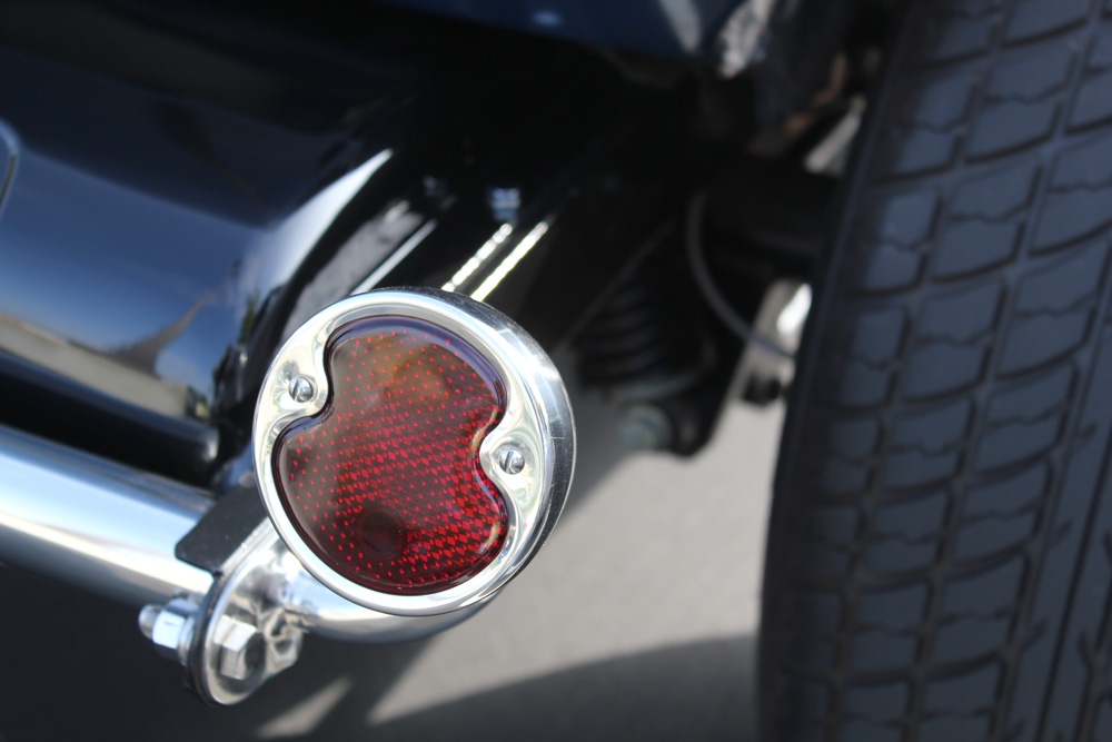 Scott presented a gauge panel designed to fit in the original dash as a Fathers Day present to Marc. Another easily missed detail is the exhaust system. Marc requested a set of Sanderson headers without the downtube and cutout. There are 5 inch long glasspacks just inside the collector. They have been such a hit that Sanderson now offers the setup. Another standout are the headlamps. A replica or an early design Guide light. Notice the peak in the turn signal lens. The three deuces are connected with progressive linkage.